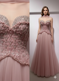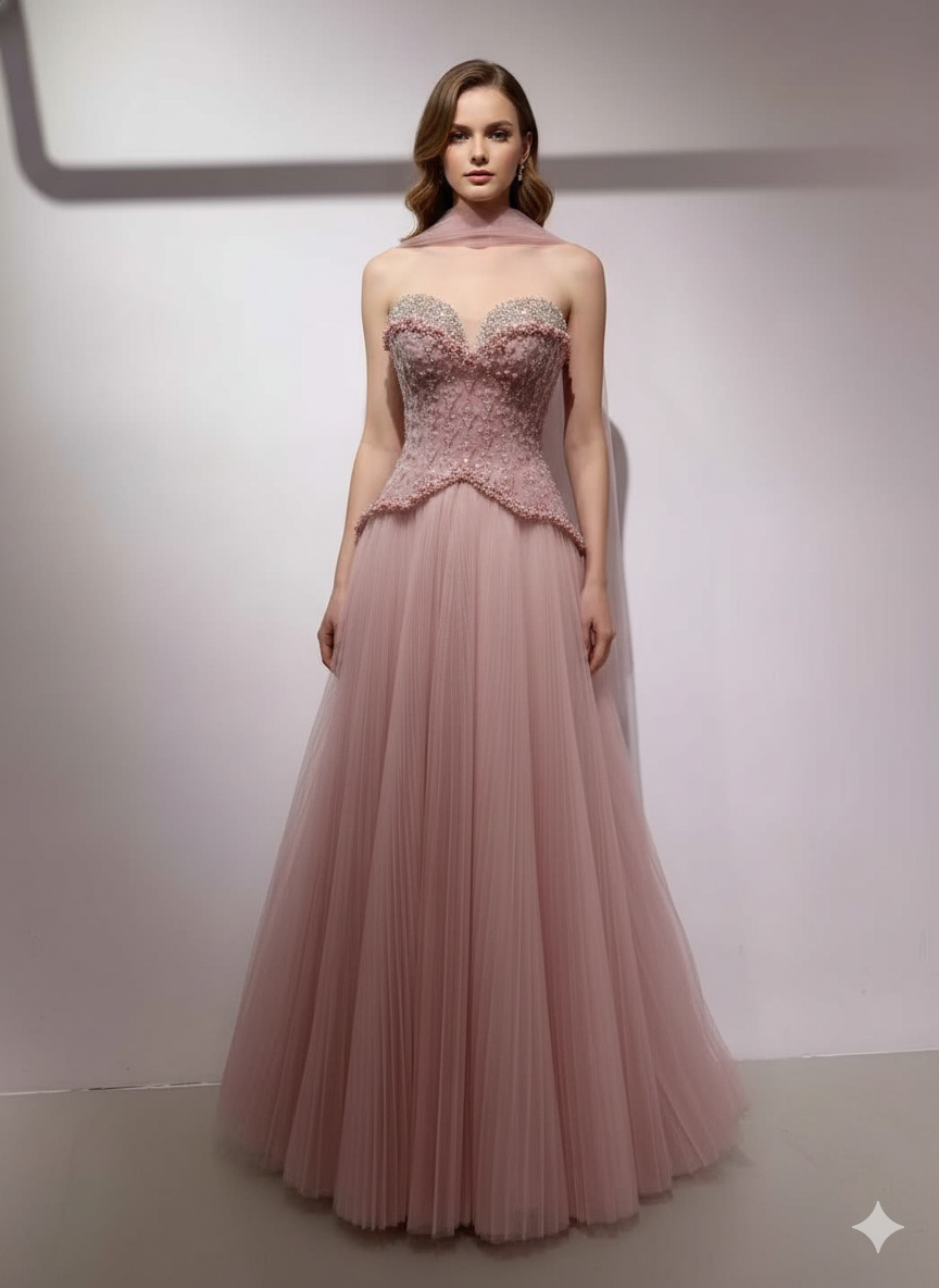 This enchanting pink evening gown features a romantic sweetheart off-shoulder neckline, exquisite beading adorning the bust and waistline, and a graceful, flowing tulle skirt. It creates an elegant and dreamy silhouette, perfect for proms, galas, or any special occasion requiring sophisticated attire