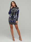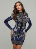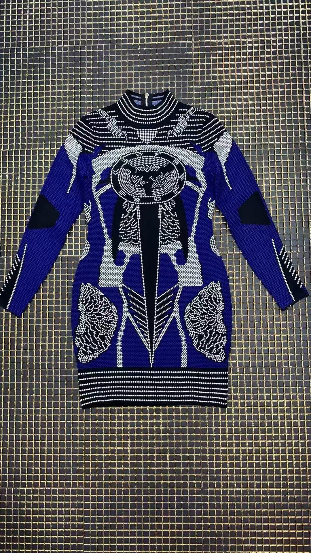 High-neck & long-sleeve design + slim-fitting mermaid silhouette, featuring a bold clash of blue, black, and white blocks adorned with dazzling diamond embellishments. The artistic pattern is ultra-eye-catching, while the body-hugging cut accentuates your curves. The intricate diamond details sparkle brilliantly, making it perfect for parties, dates, or evening events—wear it and steal the spotlight effortlessly.