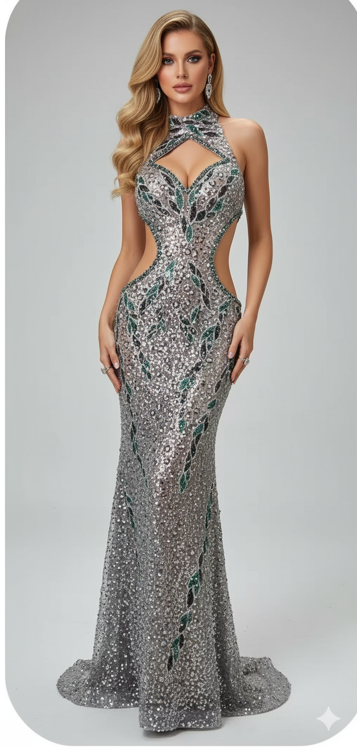 Inspired by the idea of "starry sky condensed on the clothes", this evening dress adopts a sexy design of halter neck + waist - exposing cut. It perfectly outlines the curves of the shoulders, neck and waist. The mermaid skirt falls naturally, and the elegant rhythm flows when walking. The dress is covered with hand - beaded, sequined and diamond - studded decorations, and combined with green decorative lines (or gem textures). It reflects a dazzling light under the light, as if wearing the galaxy on the body. The slim - fitting cut combined with the shiny elements not only highlights the body advantages, but also creates a luxurious and magnificent visual effect. It is a "attention - grabbing weapon" for banquets, celebrations and other occasions.