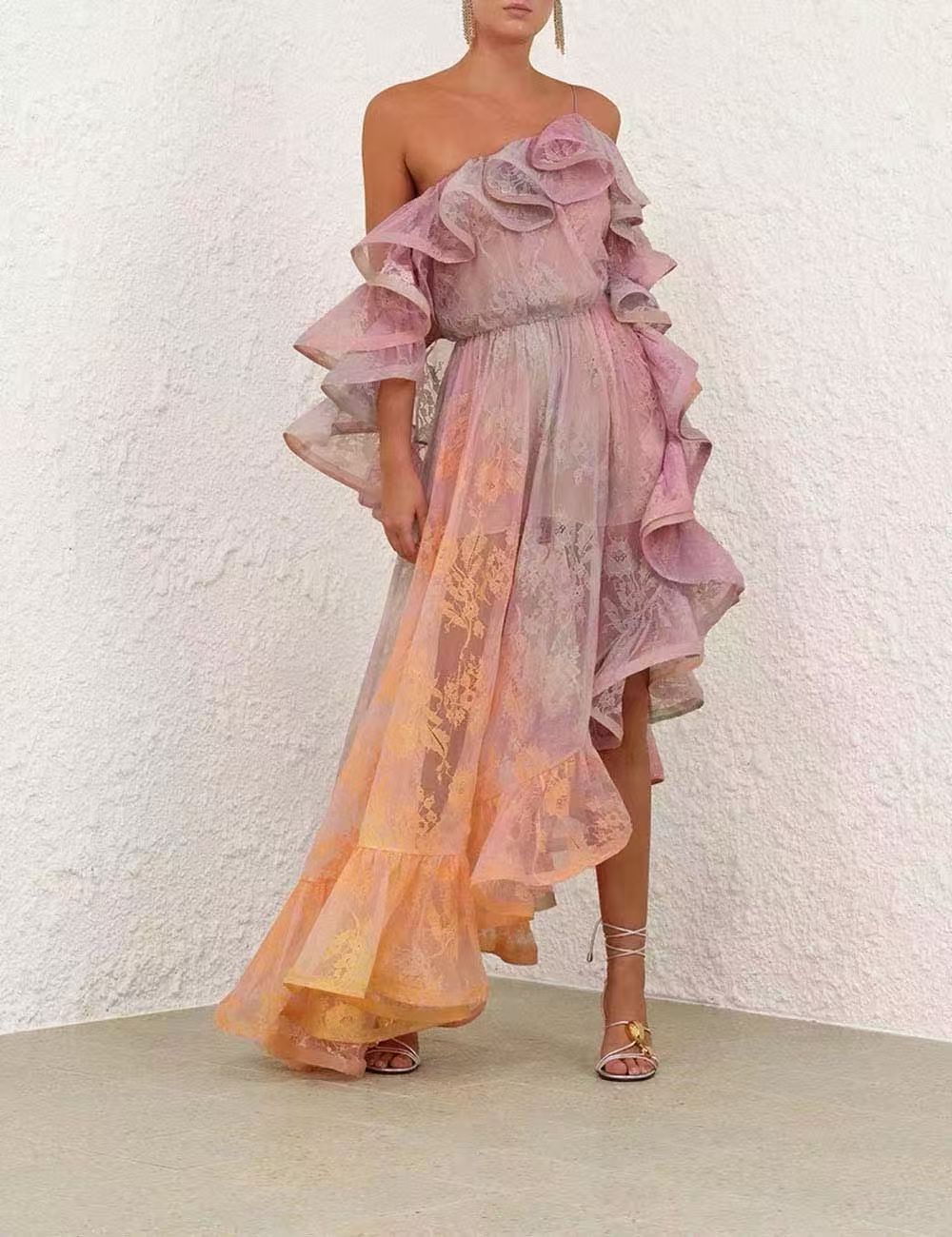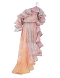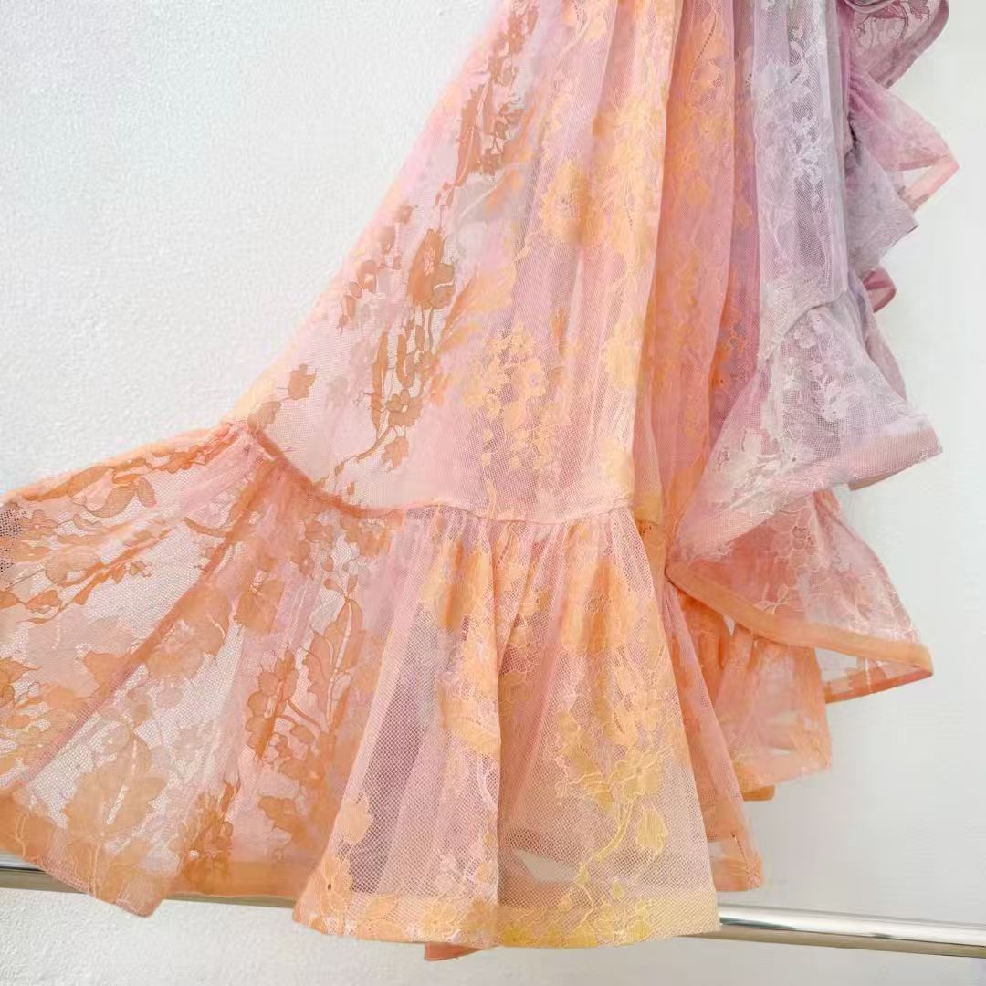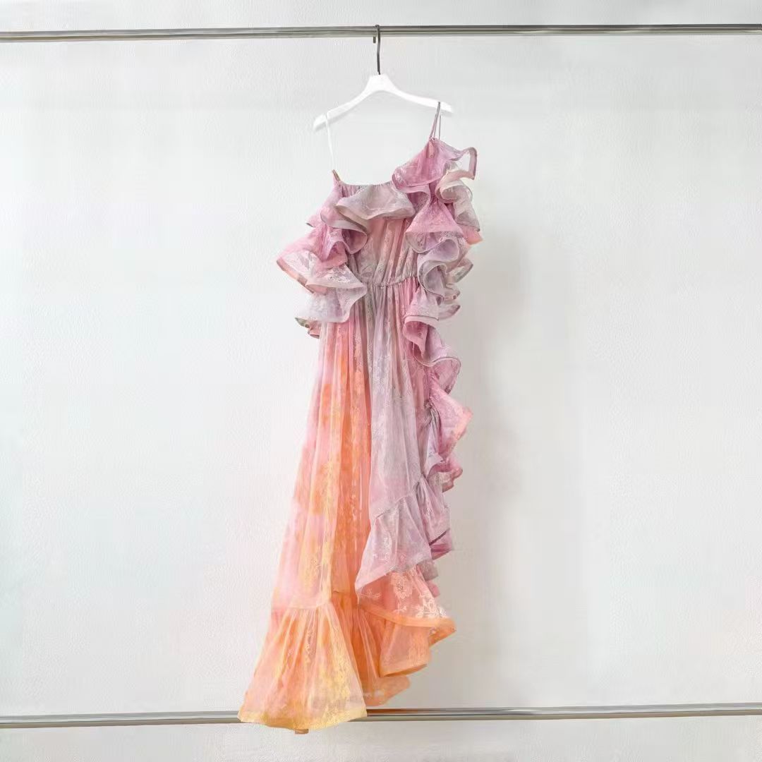 This dress features a soft gradient of pink and orange, as if the tenderness of a sunset is dyed on the garment. Three - dimensional ruffles extend from the shoulders to the hem, adding a sense of layering and a romantic atmosphere. The asymmetric hem breaks the routine and shows a casual and elegant posture when walking. The waist - cinching design skillfully outlines the waistline, and at the same time, the pleating process modifies the figure, which is friendly to various body types. The overall style is dreamy and sweet, combining artistic sense with practicality, and it is an ideal choice for girls/women who pursue a unique dressing style