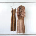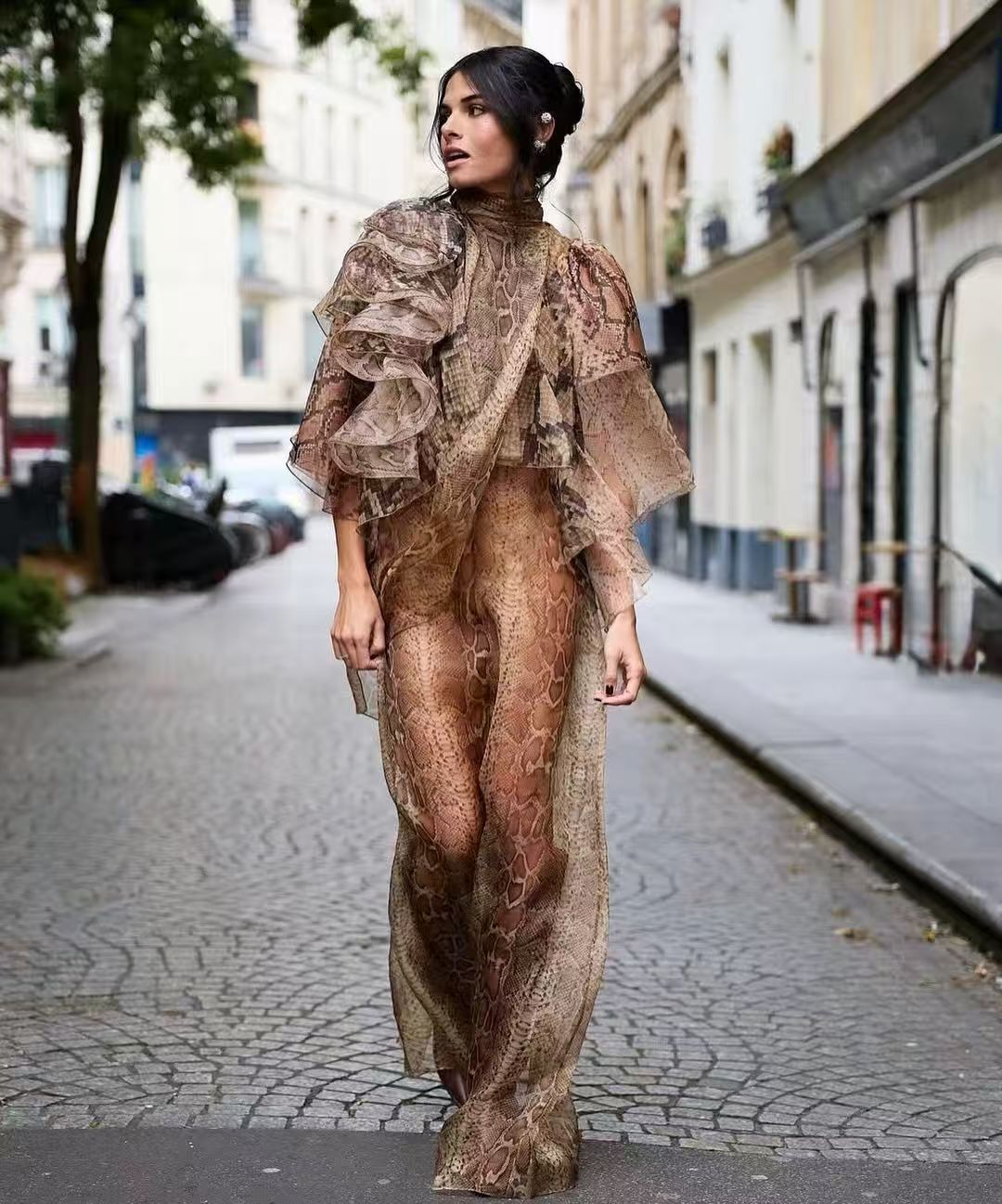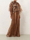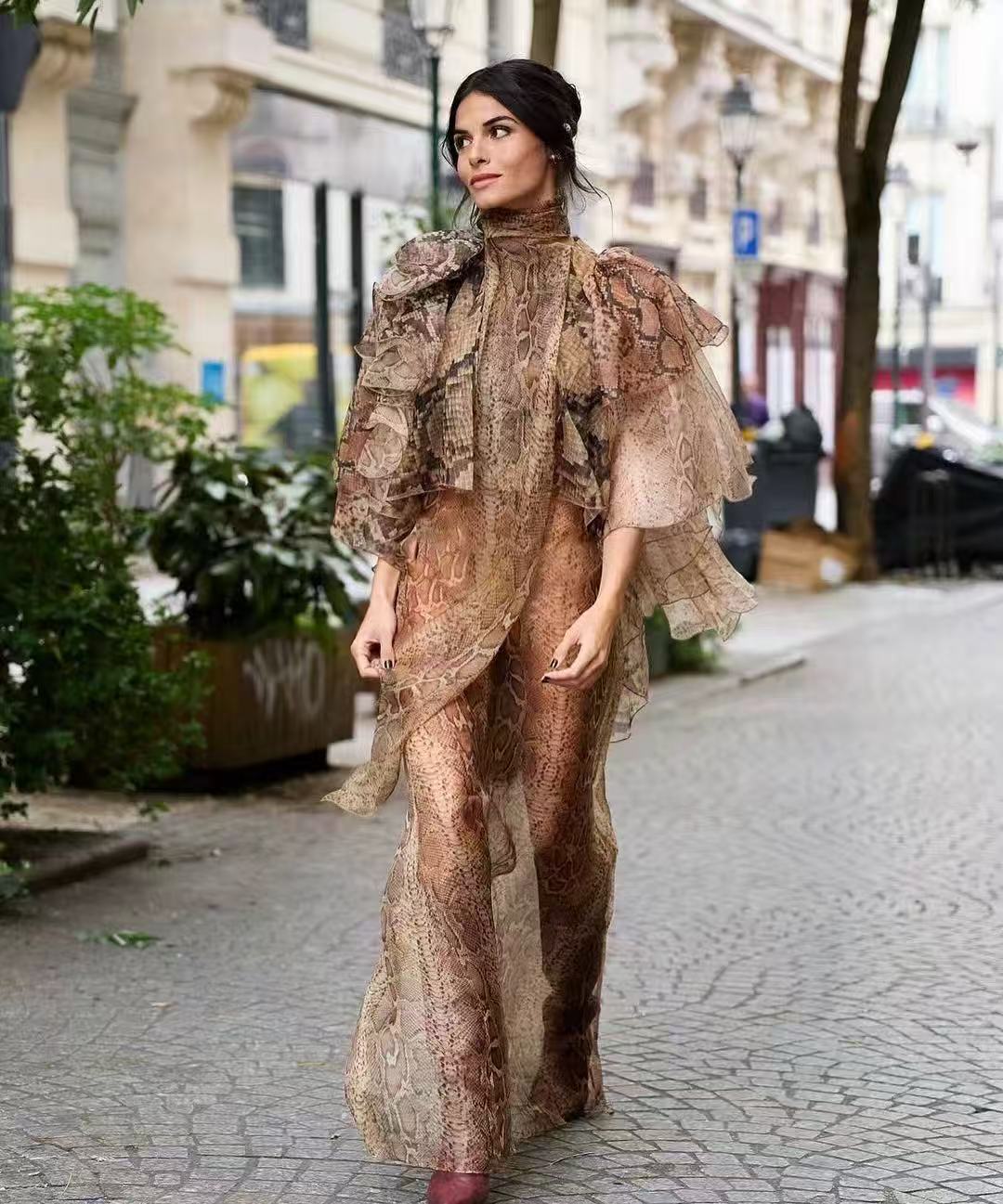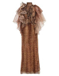 This long dress takes a retro brown color as the base and is matched with an animal - print (leopard - like) pattern, combining wildness and fashion. The design of the high neck + multi - layer ruffled cape adds a sense of softness and a retro atmosphere. The dress is made of 100% silk, which is light and flowing, showing a flexible and elegant posture when walking. The overall cut is slimming, and the long - length design elongates the body proportion. It is suitable for women who pursue a retro and luxurious style and love unique design sense.
