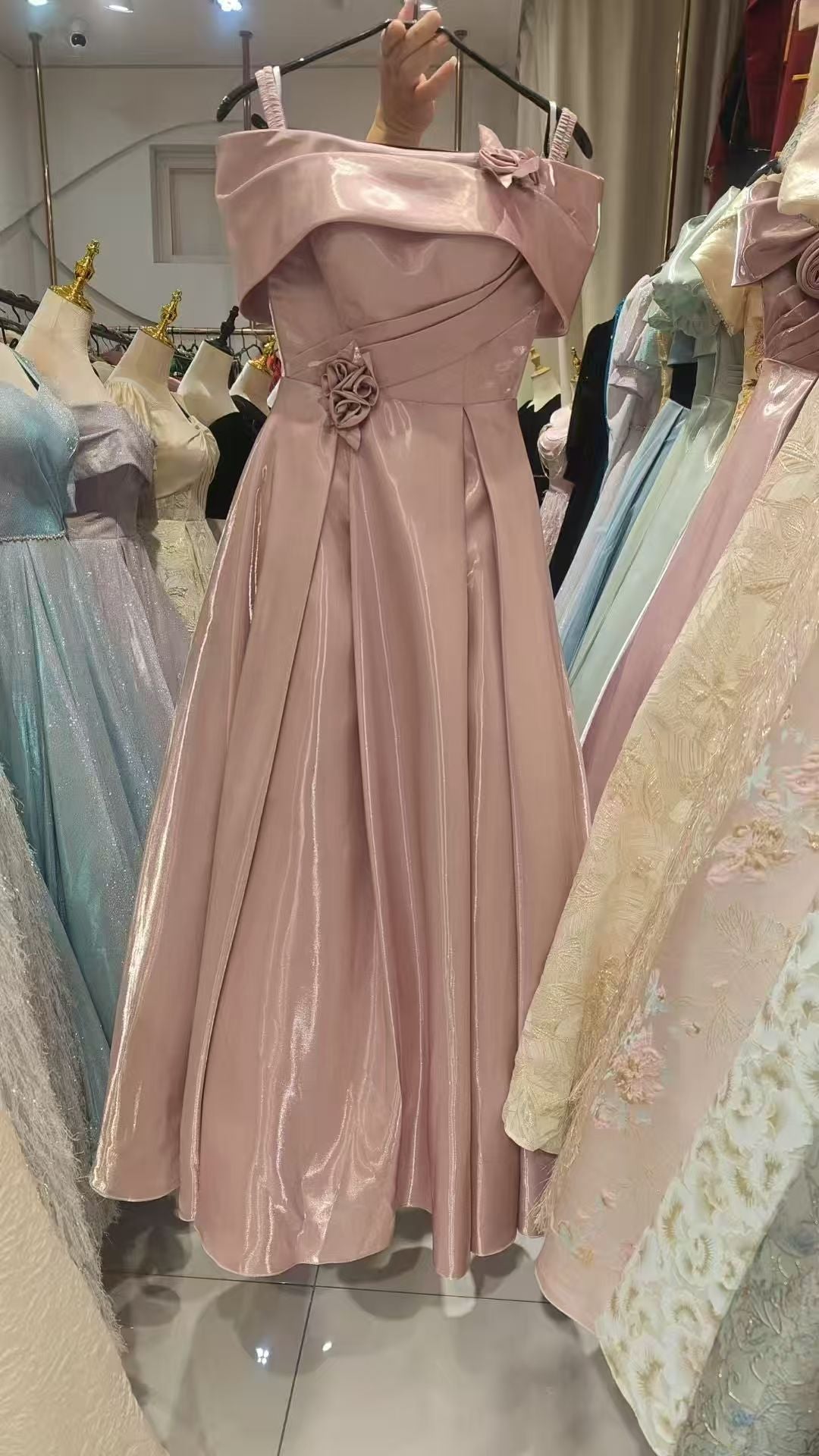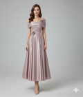 Light Pink Off-the-Shoulder Maxi Dress with Floral Waist Detail & Flowing Skirt