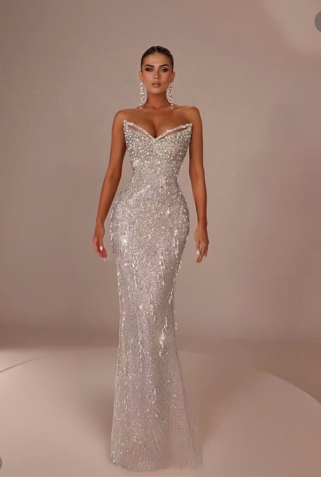 Inspired by the "Milky Way pouring over the body", this evening gown is crafted with a dense combination of rhinestones and sequins. The strapless design with a heart - shaped cut - out at the chest not only shows off the elegant shoulder and neck lines but also adds a touch of sexiness. The body - con mermaid silhouette accurately outlines the curves of the waist and hips, and the skirt flows naturally like a mermaid's tail. When you walk, it sparkles, as if you are wearing the entire starry sky.