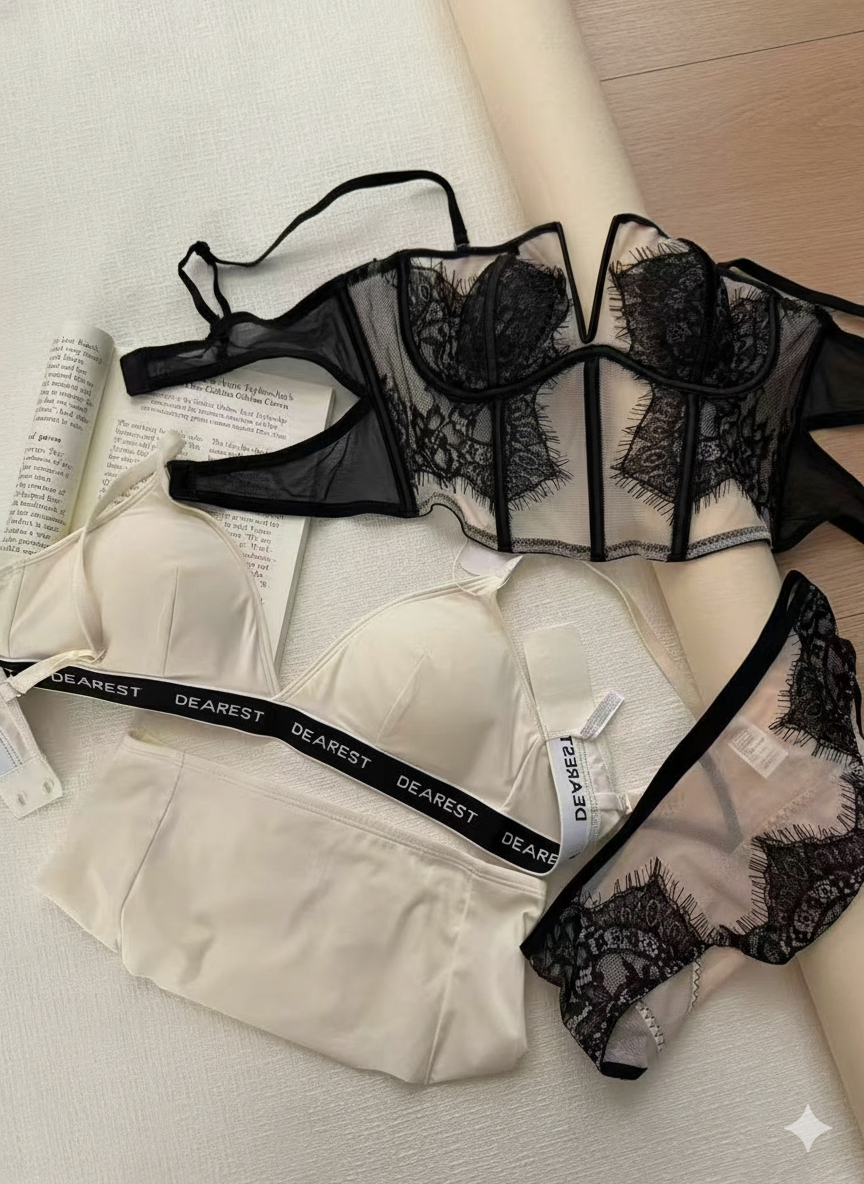 Black lace, sheer mesh, delicate trim. Ultimate dark elegance