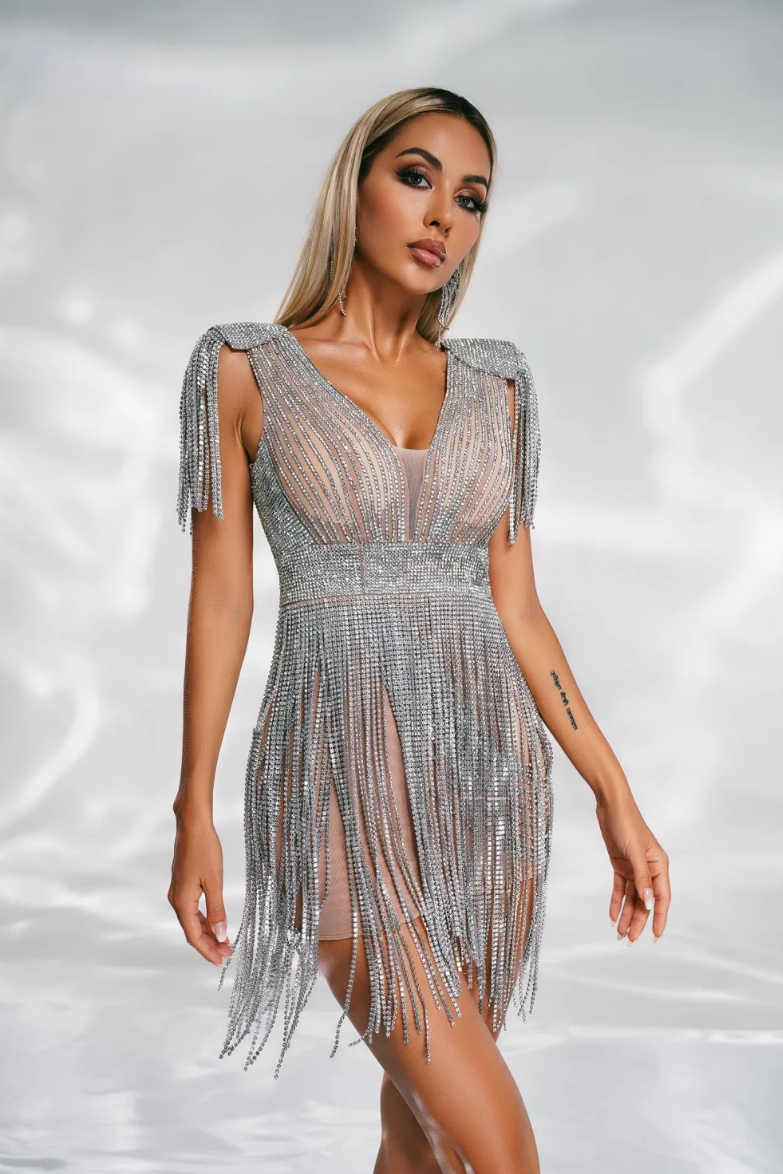 This dress features a plunging V-neckline and short sleeves adorned with fringe details, completely covered in shimmering silver sequins. The hemline ends at mid-thigh, delivering a look that is both sexy and refined