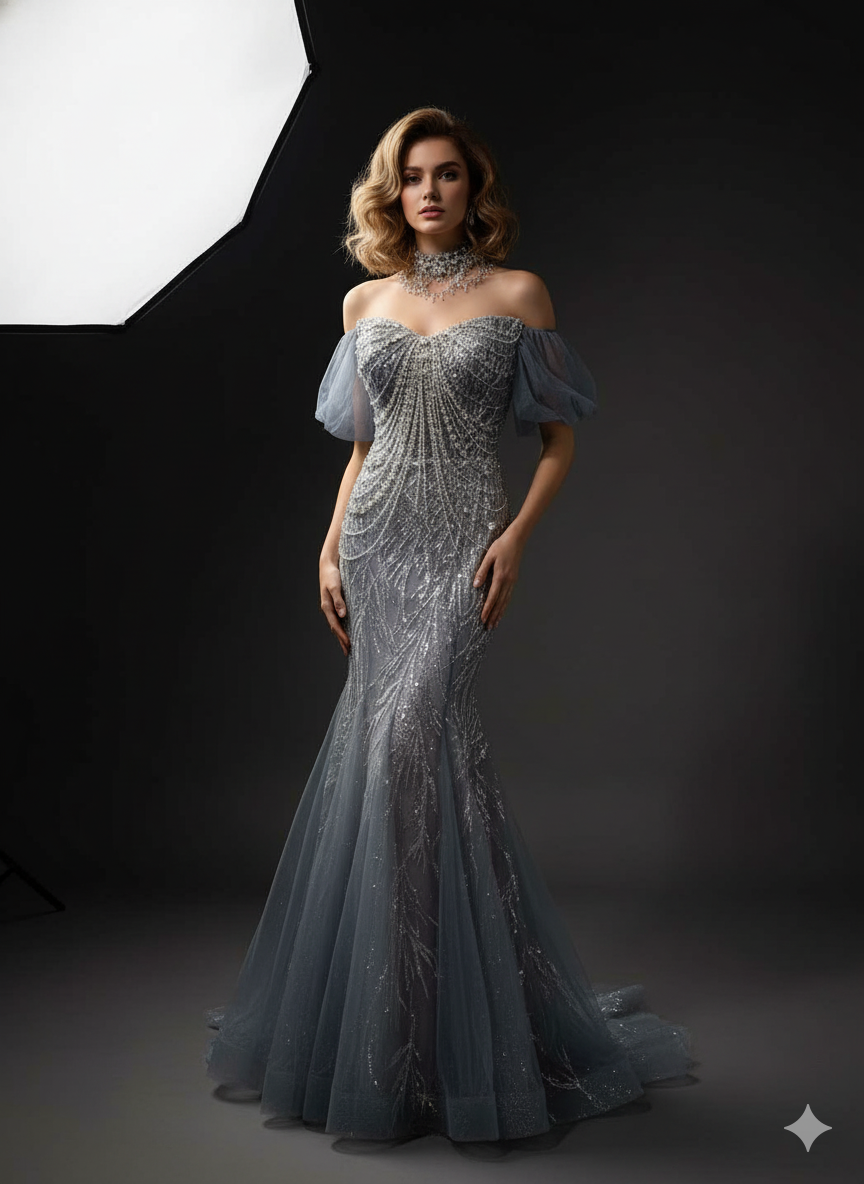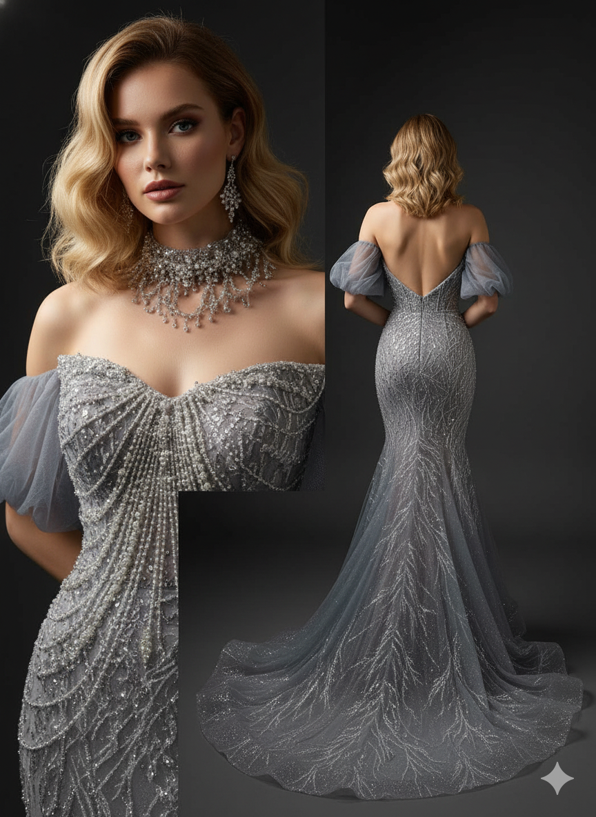 Inspired by "a mermaid's encounter with the galaxy," this gown masterfully blends the sophistication of grey tones with the brilliance of crystal embellishments. Perfect for red carpets and black-tie galas, it embodies both elegance and show-stopping allure.