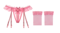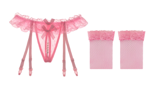 A delicate lace garter set featuring a playful bow. Worn with matching fishnets for a retro-inspired look that is both elegant and sweetly sexy