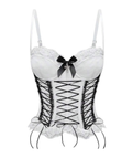 Slim-fit corset camisole with a smooth satin bow and sheer lace panel. Crisscross lacing defines the waist and flares into a romantic hem