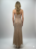 The image features a delicate, elegant evening gown displayed on a beige mannequin