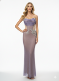 This elegant evening gown features a striking lavender mesh design. Designed as a sleeveless silhouette with delicate straps, the fitted bodice includes detailed draping across the bust, embellished with sparkling silver floral appliqués. Cutouts accentuate the waist, adding a modern and alluring touch, while the skirt falls in a sleek floor-length style. Paired with black heels, the gown stands out against a neutral grey-beige backdrop, creating a bold yet refined look perfect for special occasions.