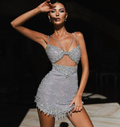 This striking silver sequin gown is displayed on a beige mannequin, featuring a sleek strapless design that forms a deep V-neckline with a central cutout embellished with sparkling crystals. The fitted bodice and mermaid skirt are completely covered in shimmering sequins, creating a dazzling, all-over shimmer. A high slit on the right leg adds a touch of allure and movement