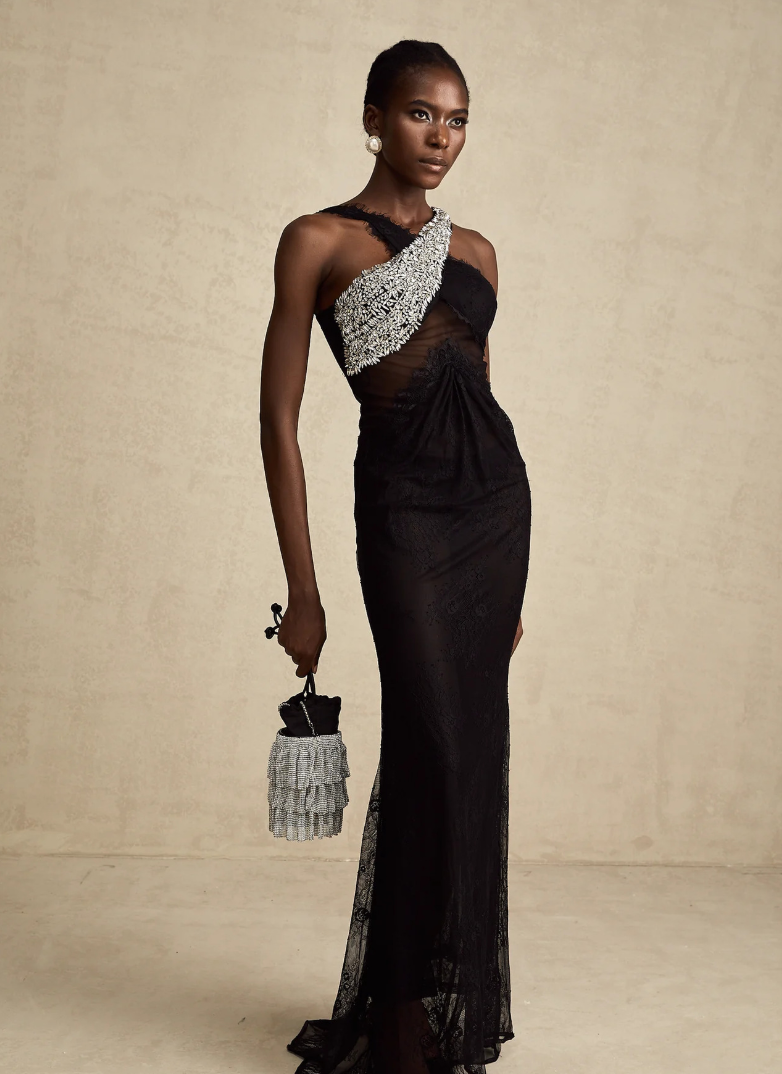 This form-fitting evening gown features a chic strapless halter neckline adorned with sparkling crystal embellishments and delicate mesh, creating a luxurious and eye-catching look